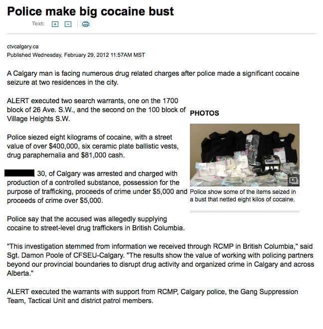 - Calgary Herald: “Calgary Man faces charges after $400,000 cocaine bust” (Feb 29, 2012)